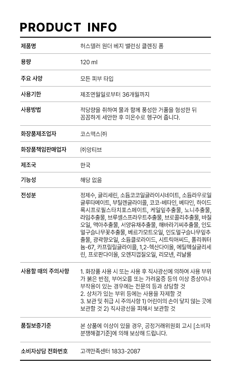 | 화장품제조업자 및 화장품책임판매업자 | 코스맥스/(주)앙티브 | 품질보증기준 | 본 제품은 공정거래위원회 고시 소비자분쟁해결 기준에 의거 교환 또는 보상 받을 수 있습니다. |