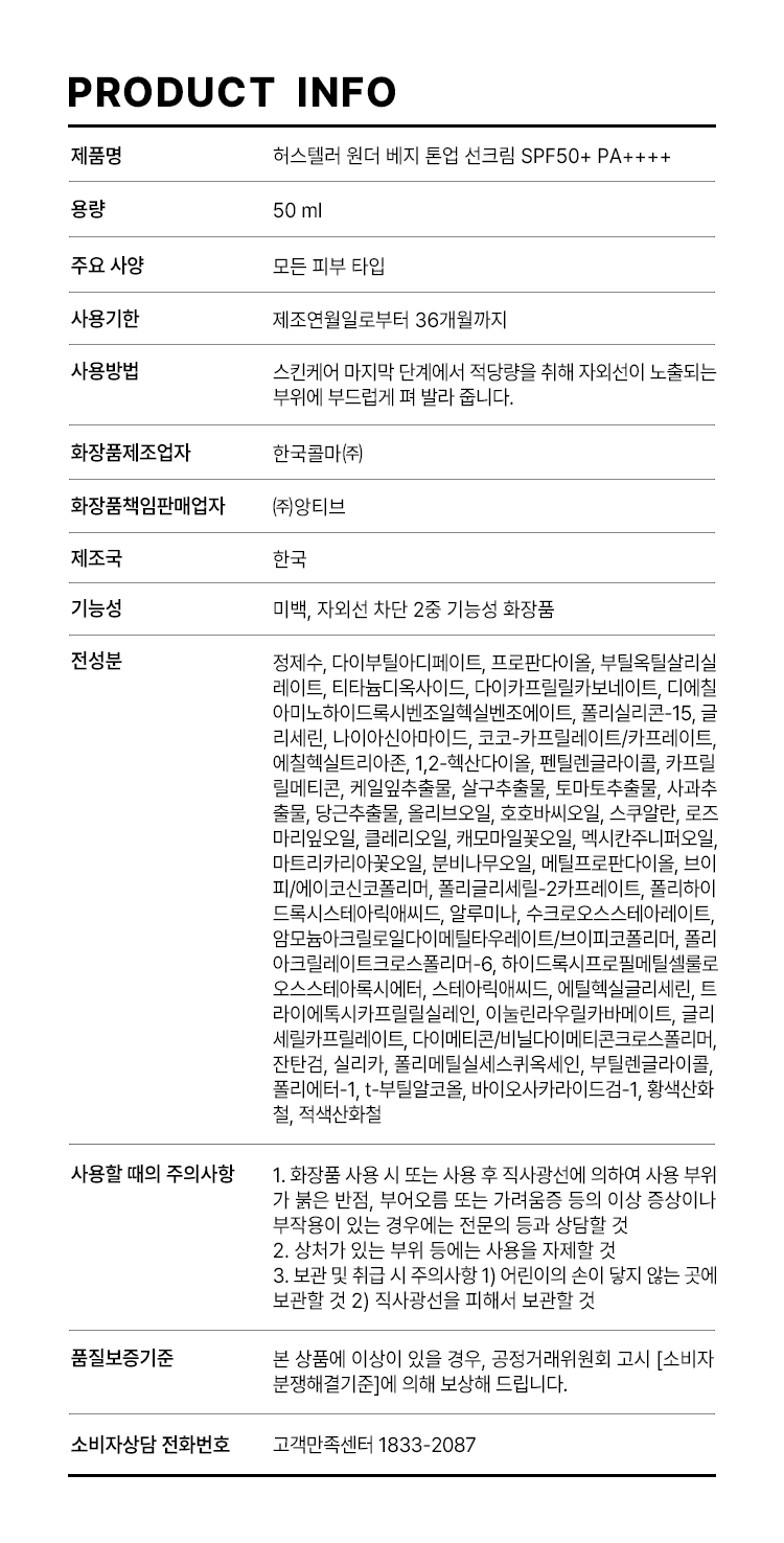 | 화장품제조업자 및 화장품책임판매업자 | 한국콜마/(주)앙티브 | 품질보증기준 | 본 제품은 공정거래위원회 고시 소비자분쟁해결 기준에 의거 교환 또는 보상 받을 수 있습니다. |