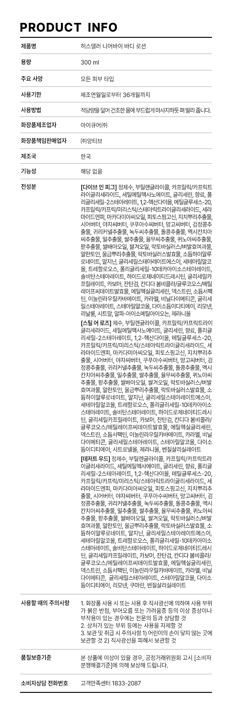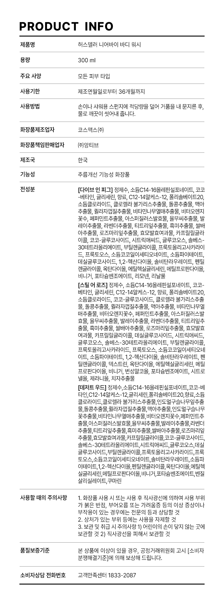 | 화장품제조업자 및 화장품책임판매업자 | [바디워시]코스맥스 [바디로션]아이큐어/(주)앙티브 | 품질보증기준 | 본 제품은 공정거래위원회 고시 소비자분쟁해결 기준에 의거 교환 또는 보상 받을 수 있습니다. |