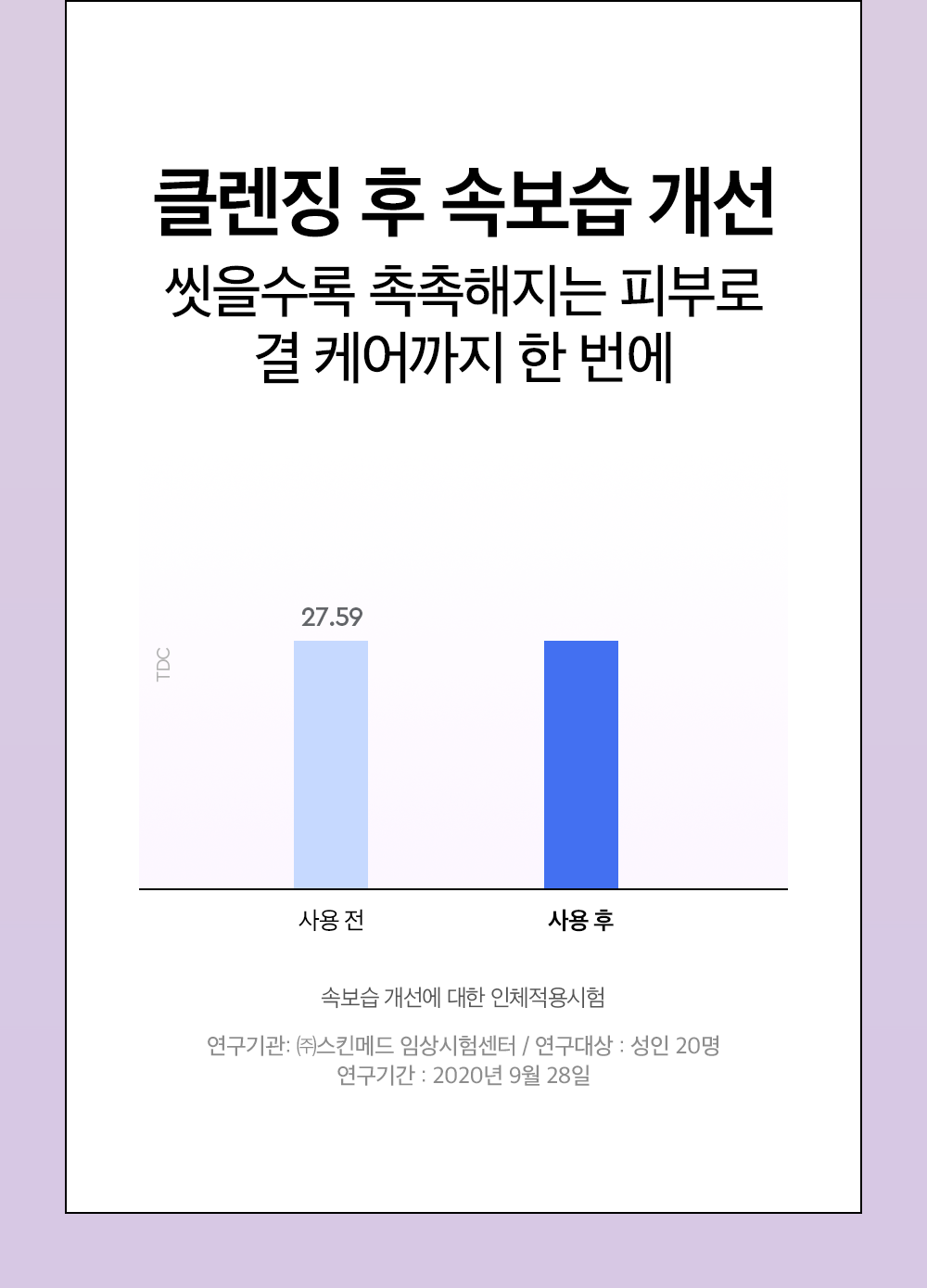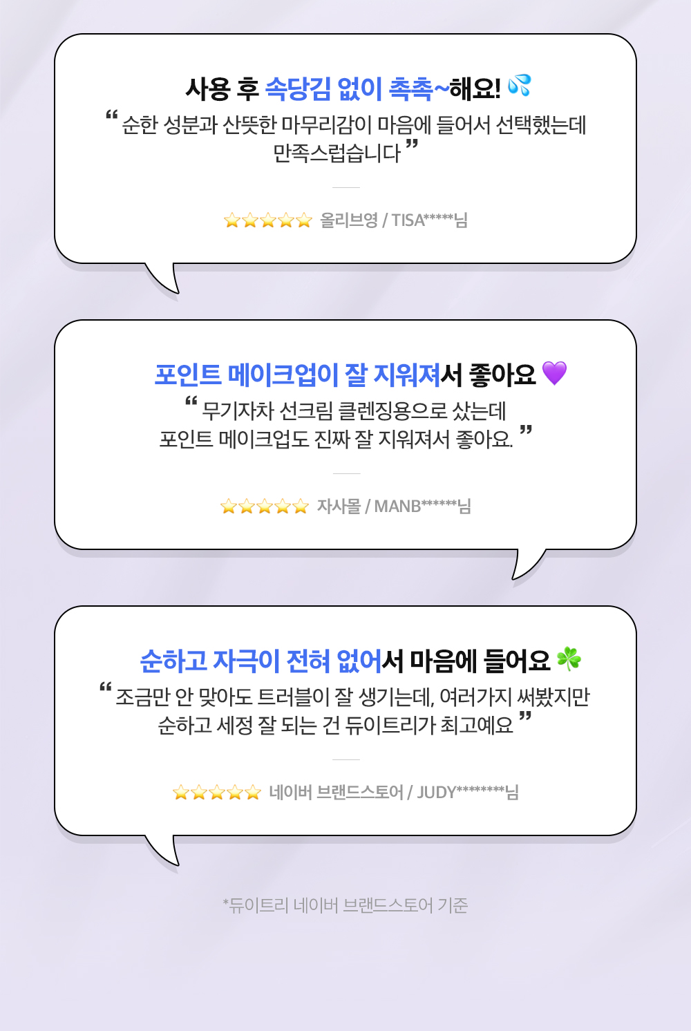 정제수, 마카다미아씨오일, 다이프로필렌글라이콜, 글리세린, 1,2-헥산다이올, 베타인, C14-22알코올, 폴리솔베이트80, 글리세릴스테아레이트, 세테아릴올리베이트, 데실글루코사이드, 솔비탄올리베이트, 아라키딜알코올, C12-20알킬글루코사이드, 베헤닐알코올, 아라키딜글루코사이드, 에틸헥실글리세린, 잔탄검, 토코페롤, 아크릴레이트/C10-30알킬아크릴레이트크로스폴리머, 알지닌, 글루코오스, 글리세릴글루코사이드, 부틸렌글라이콜, 소듐라우로일귀리아미노산(3 ppm), 소듐코코일애플아미노산(2.55 ppm), 옥틸도데칸올, 하이드로제네이티드레시틴, 우유단백질추출물(0.05 ppm), 헥실렌글라이콜, 세라마이드 3 (세라마이드엔피), 자작나무수액, 하이알루로닉애씨드, 코코넛야자열매추출물, 테트라소듐글루타메이트다이아세테이트, 카프릴릴글라이콜, 다이소듐이디티에이, 라벤더오일 |