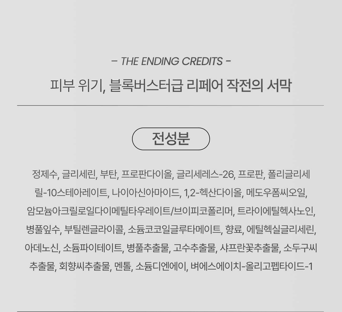 정제수, 글리세린, 부탄, 프로판다이올, 글리세레스-26, 프로판, 나이아신아마이드, 폴리글리세릴-10스테아레이트, 1,2-헥산다이올, 메도우폼씨오일, 암모늄아크릴로일다이메틸타우레이트/브이피코폴리머, 트라이에틸헥사노인, 소듐코코일글루타메이트, 엑토인, 향료, 에틸헥실글리세린, 락토페린, 하이드롤라이즈드콜라겐, 아데노신, 다이소듐이디티에이,하이드록시에틸셀룰로오스, 구아바잎추출물, 바실러스발효물, 풀루란, 제주조릿대추출물, 보검선인장줄기추출물, 하이드로제네이티드레시틴, 부틸렌글라이콜, 세테아릴알코올, 스테아릭애씨드, 글라이신, 세린, 글루타믹애씨드, 아스파틱애씨드, 류신, 세라마이드엔피, 알라닌, 라이신, 알지닌, 타이로신, 페닐알라닌, 발린, 트레오닌, 프롤린, 아이소류신, 세라마이드엔에스, 히스티딘, 메티오닌, 시스테인, 콜레스테롤, 피토스핑고신, 세라마이드에이에스, 세라마이드에이피, 세라마이드이오피