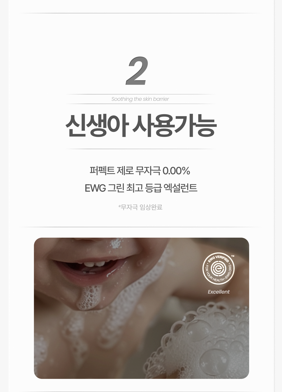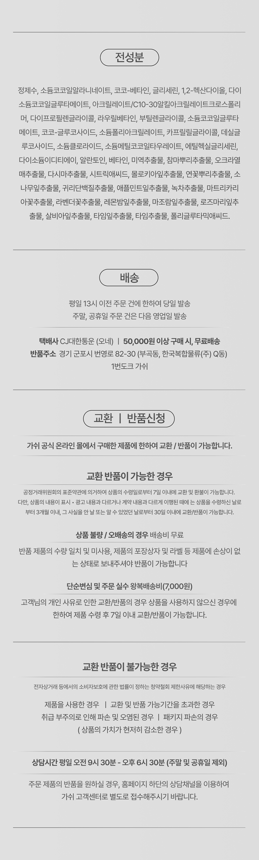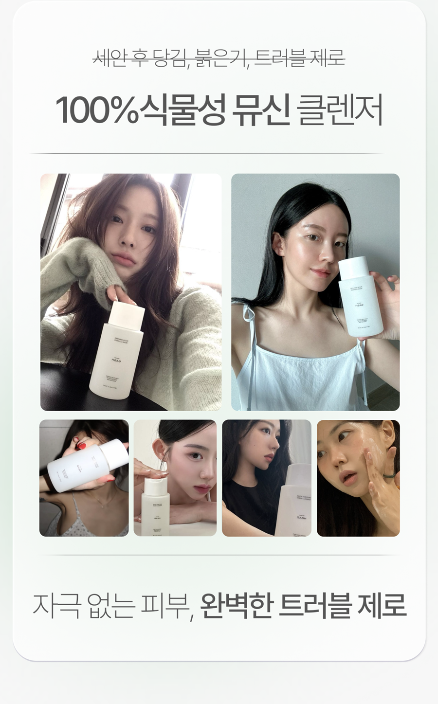정제수, 소듐코코일알라니네이트, 코코-베타인, 글리세린, 1,2-헥산다 이올, 다이소듐코코일글루타메이트, 아크릴레이트/C10-30알킬아크 릴레이트크로스폴리머, 다이프로필렌글라이콜, 라우릴베타인, 부틸렌 글라이콜, 소듐코코일글루타메이트, 코코-글루코사이드, 소듐폴리아 크릴레이트, 카프릴릴글라이콜, 데실글루코사이드, 소듐클로라이드, 소듐메틸코코일타우레이트, 에틸헥실글리세린, 다이소듐이디티에이, 알란토인, 베타인, 미역추출물(50ppm), 참마뿌리추출물(40ppm), 오 크라열매추출물(30ppm), 다시마추출물(20ppm), 시트릭애씨드, 몰로 키아잎추출물(10ppm), 연꽃뿌리추출물(10ppm), 소나무잎추출물, 귀리단백질추출물, 애플민트잎추출물, 녹차추출물, 마트리카리아꽃추 출물, 라벤더꽃추출물, 레몬밤잎추출물, 마조람잎추출물, 로즈마리잎 추출물, 살비아잎추출물, 타임잎추출물,타임추출물, 폴리글루타믹애 씨드 |